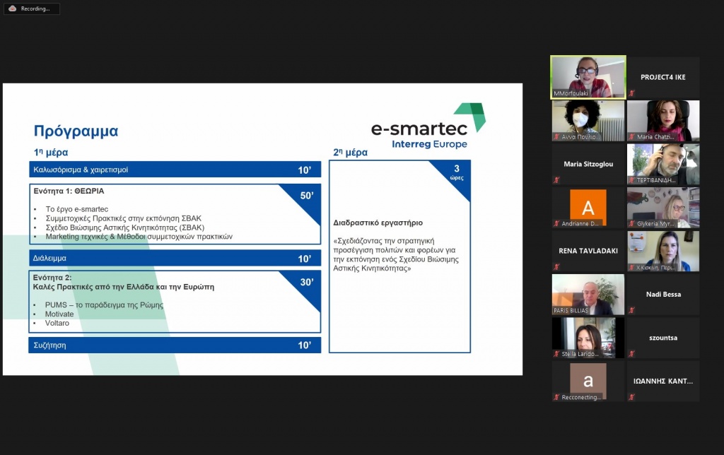 Η Περιφέρεια Κεντρικής Μακεδονίας, στο πλαίσιο της συμμετοχής της στο έργο e-smartec (enhanced sustainable mobility with marketing techniques) του Προγράμματος Ευρωπαϊκής Διαπεριφερειακής Συνεργασίας INTERREG EUROPE 2014-2020, σε συνεργασία με το Περιφερειακό Ταμείο Ανάπτυξης Κεντρικής Μακεδονίας και το Ινστιτούτο Βιώσιμης Κινητικότητας και Δικτύων Μεταφορών του Εθνικού Κέντρου Έρευνας και Τεχνολογικής Ανάπτυξης διοργάνωσε την Πέμπτη 4 Μαρτίου 2021 και την Παρασκευή 5 Μαρτίου 2021, διαδικτυακό εκπαιδευτικό σεμινάριο με θέμα: «Χρήση τεχνικών μάρκετινγκ για την αύξηση της συμμετοχής των πολιτών και των εμπλεκομένων φορέων στην υλοποίηση ΣΒΑΚ».