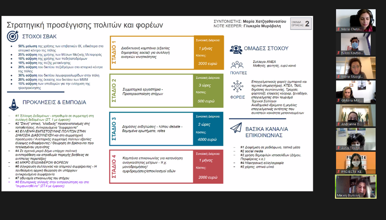 Το δεύτερο μέρος του εκπαιδευτικού σεμιναρίου έλαβε χώρα την Παρασκευή 5 Μαρτίου 2021, όπου οι συμμετέχοντες χωρίστηκαν σε δύο ομάδες για την υλοποίηση διαδραστικής άσκησης σχεδιασμού μιας στρατηγικής για την προσέγγιση πολιτών και φορέων και την εμπλοκή αυτών στο ΣΒΑΚ, σε ένα υποθετικό σενάριο πόλης. Κατά τη διάρκεια της άσκησης, οι συμμετέχοντες κλήθηκαν σε κάθε στάδιο του ΣΒΑΚ να αναγνωρίσουν προκλήσεις και εμπόδια, να προτείνουν κατάλληλες συμμετοχικές πρακτικές, καθώς και τις ομάδες στόχου και τα κανάλια επικοινωνίας που θα χρησιμοποιηθούν σε κάθε προτεινόμενη πρακτική. Μετά την ολοκλήρωσή των εργασιών των δύο ομάδων, ένας εκπρόσωπος από κάθε ομάδα παρουσίασε τα αποτελέσματα της άσκησης στην ολομέλεια για συζήτηση και ανταλλαγή απόψεων.