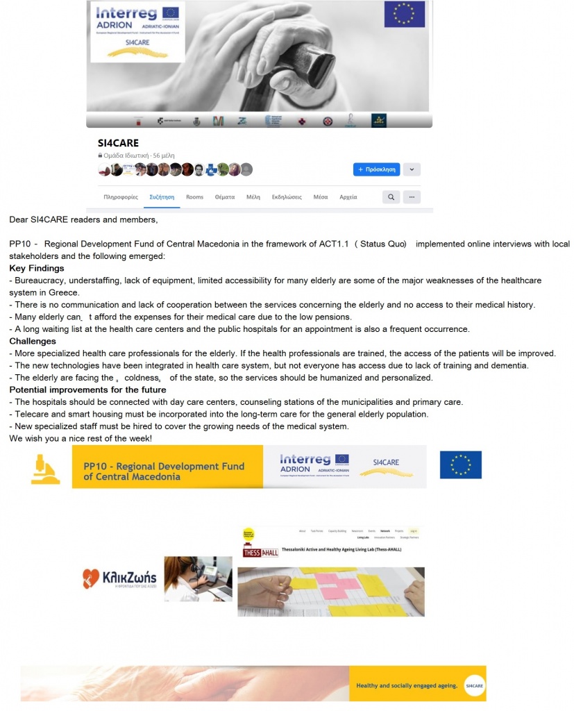 Το Περιφερειακό Ταμείο Ανάπτυξης Κεντρικής Μακεδονίας, ως εταίρος του έργου «Social Innovation for integrated health CARE of ageing population in ADRION Regions- Κοινωνική καινοτομία για την ολοκληρωμένη φροντίδα υγείας ηλικιωμένων στις περιφέρειες ADRION» με ακρωνύμιο SI4CARE,πραγματοποίησε διαδικτυακές συνεντεύξεις με τοπικούς εμπλεκόμενους φορείς, από τις οποίες προέκυψαν τα ακόλουθα συμπεράσματα σχετικά με το Εθνικό Σύστημα Υγειονομικής Περίθαλψης των Ηλικιωμένων.