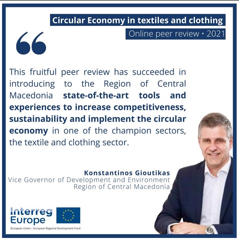 Εκδήλωση Μεταφοράς Τεχνογνωσίας / Peer Review με θέμα “Circular Economy in textiles and clothing” (Κυκλική οικονομία στα κλωστοϋφαντουργικά προϊόντα και τα είδη ένδυσης) διοργάνωσε διαδικτυακά το Περιφερειακό Ταμείο Ανάπτυξης Κεντρικής Μακεδονίας για λογαριασμό της Περιφέρειας Κεντρικής Μακεδονίας (δελτίο τύπου 07/10/2021: https://pkm.gov.gr/default.aspx?lang=el-GR&page=35&pressid=22760) .