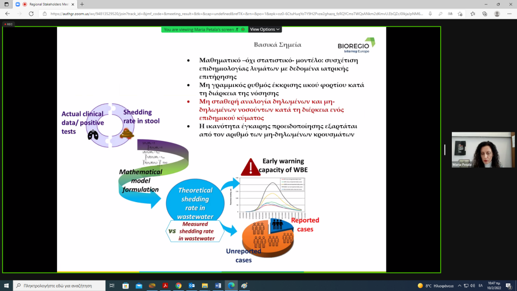 Η κ. Μαρία Πεταλά (Δρ., Ε.ΔΙ.Π., Τμήμα Πολιτικών Μηχανικών, ΑΠΘ), ως εκπρόσωπος της Ομάδας Επιδημιολογίας Λυμάτων, ανέλυσε τη χρήση της επιδημιολογίας λυμάτων για την εκτίμηση του συνολικού φορτίου SARS CoV-2 στον πληθυσμό της μητροπολιτικής περιοχής Θεσσαλονίκης, στο πλαίσιο της έρευνας που διεξάγει η επιστημονική ομάδα του Αριστοτελείου Πανεπιστημίου Θεσσαλονίκης με έμφαση στην ανάπτυξη και την εφαρμογή ενός φυσικοχημικού μαθηματικού μοντέλου που μπορεί να εκτιμήσει τη συγκέντρωση του γονιδιώματος του ιού στα λύματα, καθώς επίσης και να εξάγει ποσοτικούς δείκτες του επιπέδου διασποράς του ιού σε όλη την κοινότητα και όχι μόνο στα δηλωθέντα κρούσματα της COVID-19. Έπειτα, έγινε περιγραφή ενός μοντέλου που εκτιμά τη διασπορά του ιού σε ένα αποχετευτικό δίκτυο χρησιμοποιώντας δεδομένα του δικτύου της μητροπολιτικής περιοχής της Θεσσαλονίκης. Επιπλέον, αναλύθηκε μαθηματικό μοντέλο της ομάδας που υπολογίζει τον αριθμό των πραγματικών κρουσμάτων (δηλωθέντων και μη) στην πόλη της Θεσσαλονίκης λαμβάνοντας υπόψη των αριθμό των ημερήσιων κρουσμάτων και του ιικού φορτίου στα λύματα. Η παρουσίαση έκλεισε με την παρουσίαση μίας απλής, γρήγορης και καινοτόμας μεθοδολογίας προσδιορισμού της μετάλλαξης όμικρον στο ιικό φορτίο των λυμάτων.