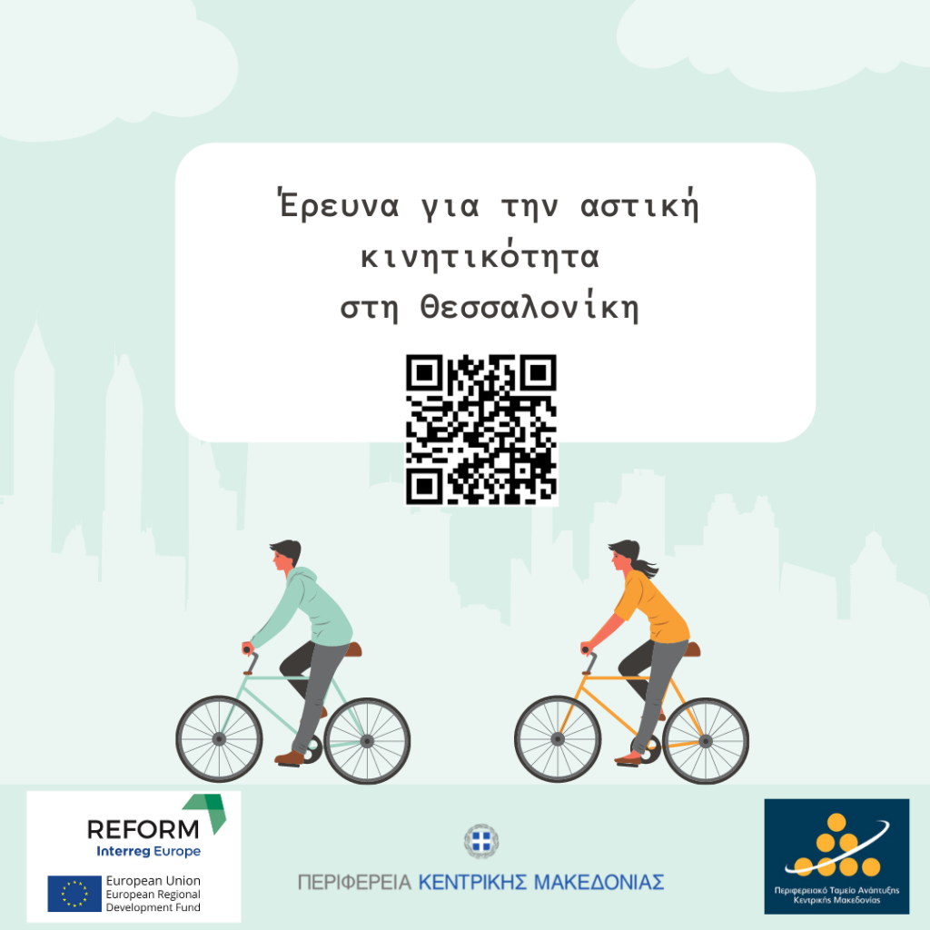 Έρευνα με θέμα την αστική κινητικότητα διεξάγεται στο πλαίσιο των πρόσθετων δράσεων του έργου REFORM – “Integrated REgional Action Plan For Innovative, Sustainable and LOw CaRbon Mobility”, το οποίο συγχρηματοδοτείται από το Ευρωπαϊκό Πρόγραμμα Διαπεριφερειακής Συνεργασίας Interreg Europe 2014-2020 και υλοποιείται από το Περιφερειακό Ταμείο Ανάπτυξης Κεντρικής Μακεδονίας για λογαριασμό της Περιφέρειας Κεντρικής Μακεδονίας.