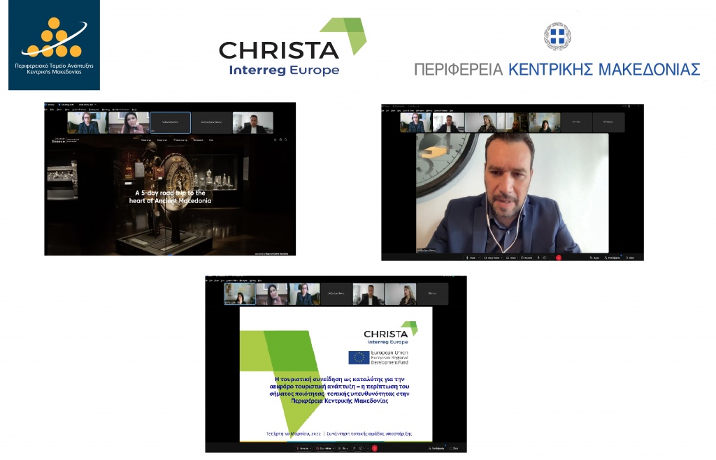 Συνάντηση της Τοπικής Ομάδας Υποστήριξης των πρόσθετων δράσεων του έργου CHRISTA για τον βιώσιμο πολιτιστικό τουρισμό, διοργάνωσε διαδικτυακά η Περιφέρεια Κεντρικής Μακεδονίας και το Περιφερειακό Ταμείο Ανάπτυξης με τη συμμετοχή φορέων και επιχειρήσεων από τον χώρο του τουρισμού και του πολιτισμού της Κεντρικής Μακεδονίας.