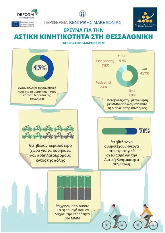 Διαδικτυακή έρευνα σε πολίτες με θέμα την αστική κινητικότητα πραγματοποιήθηκε το πλαίσιο των πρόσθετων δράσεων του έργου REFORM – “Integrated REgional Action Plan For Innovative, Sustainable and LOw CaRbon Mobility” (https://www.interregeurope.eu/reform) το οποίο συγχρηματοδοτείται από το Ευρωπαϊκό Πρόγραμμα Διαπεριφερειακής Συνεργασίας Interreg Europe 2014-2020 και υλοποιείται από το Περιφερειακό Ταμείο Ανάπτυξης Κεντρικής Μακεδονίας για λογαριασμό της Περιφέρειας Κεντρικής Μακεδονίας.